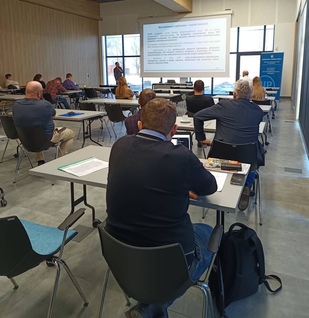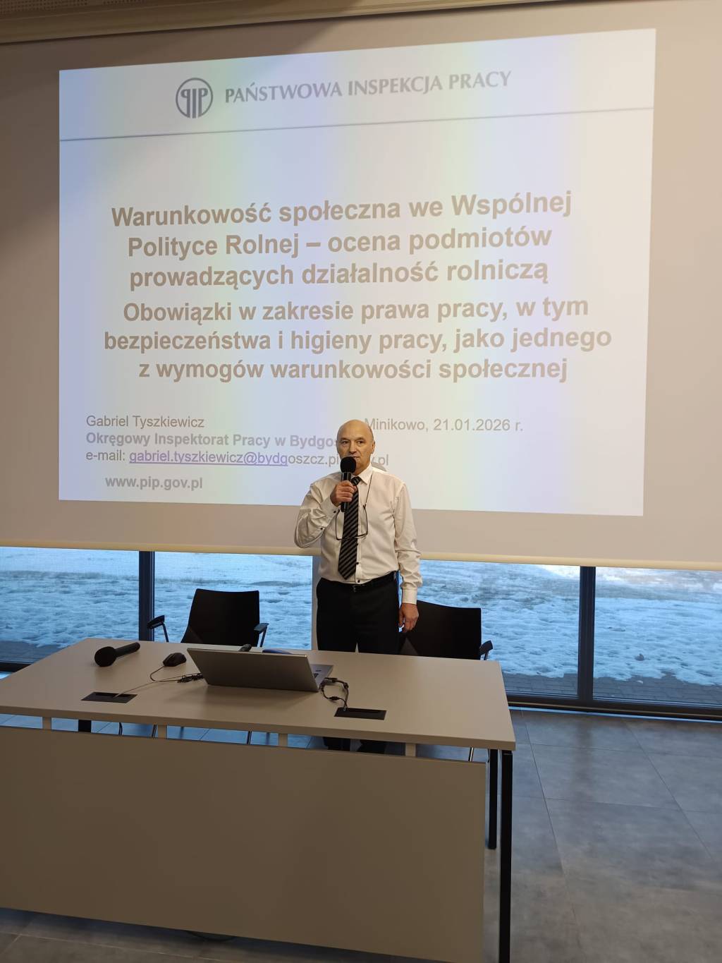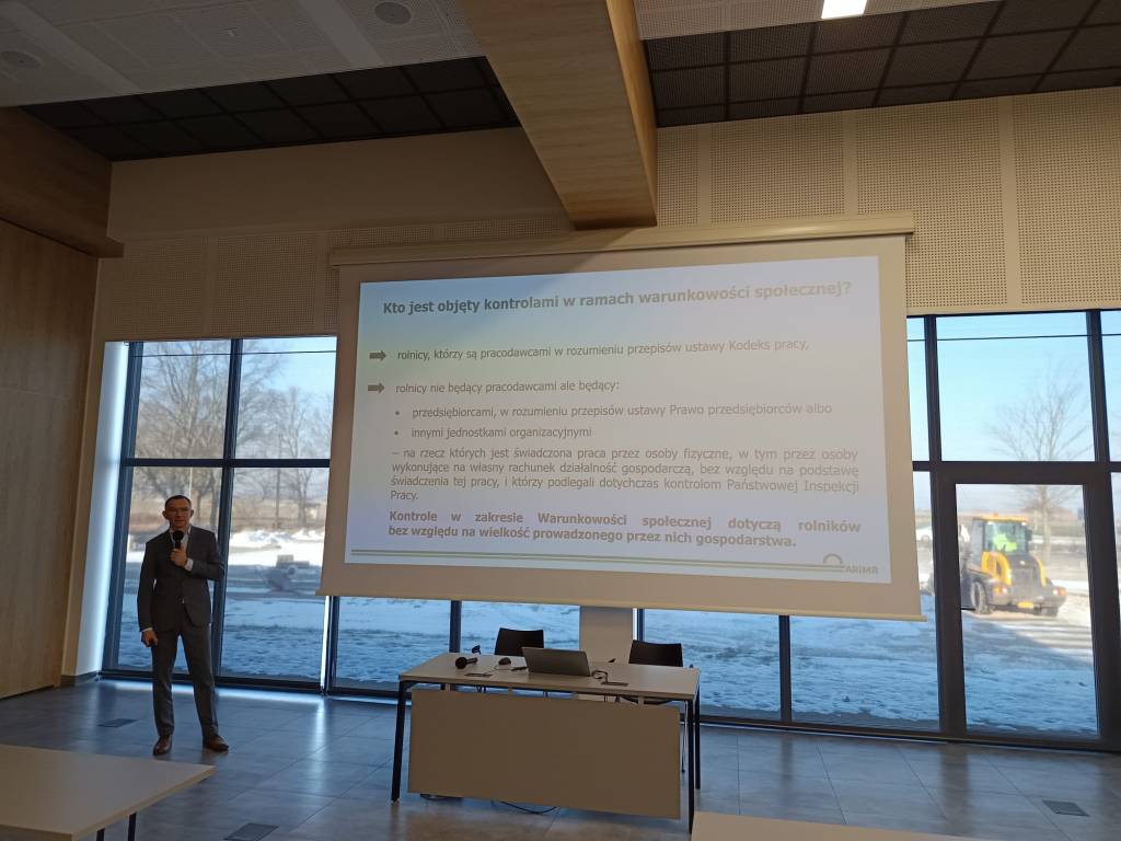 Jednym z prelegentów był Gabriel Tyszkiewicz, inspektor pracy, który omówił niezwykle istotny temat oceny prowadzących działalność rolniczą w zakresie przestrzegania prawa pracy, w tym przepisów BHP, jako jednego z kluczowych wymogów warunkowości społecznej.