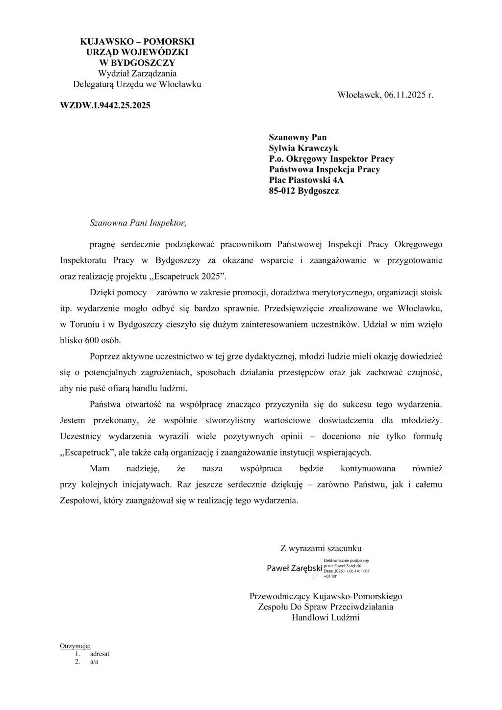 W dniu dzisiejszym dotarło do nas wyjątkowe podziękowanie od Kujawsko-Pomorskiego Urzędu Wojewódzkiego w Bydgoszczy za nasze wsparcie i zaangażowanie w realizację projektu „Escapetruck 2025”.