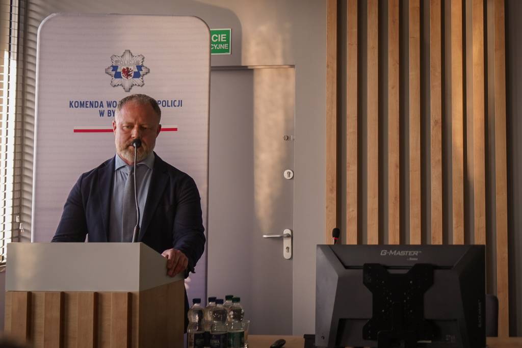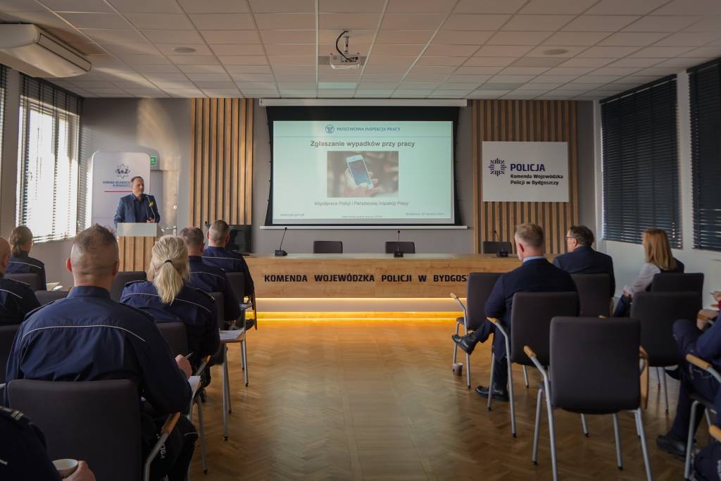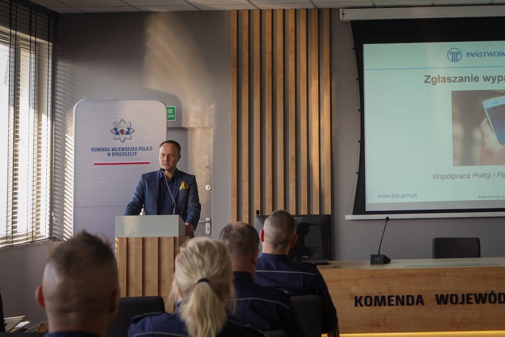 Zastępca Okręgowego Inspektora Pracy Grzegorz Meler omówił zasady współpracy Inspekcji Pracy z Policją, podkreślając znaczenie wymiany informacji oraz koordynacji działań między instytucjami.