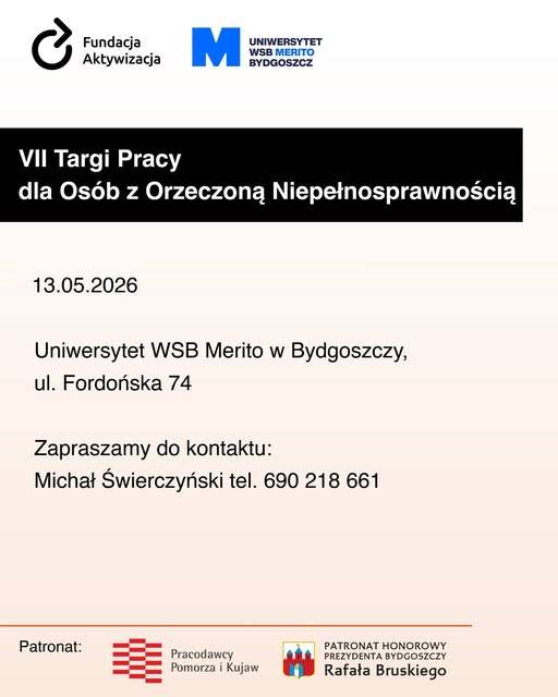VII Targi Pracy dla Osób z Niepełnosprawnościami są organizowane przez Fundację Aktywizacja we współpracy z Uniwersytetem WSB Merito Bydgoszcz.